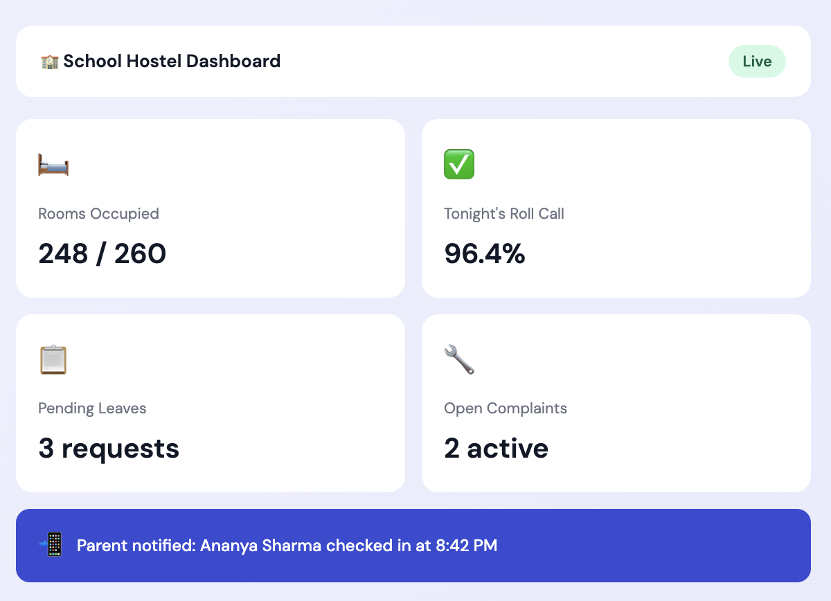 Run morning, evening, and night roll-calls from a mobile app. Auto-flag absentees and instantly alert wardens and parents — no paper registers needed.